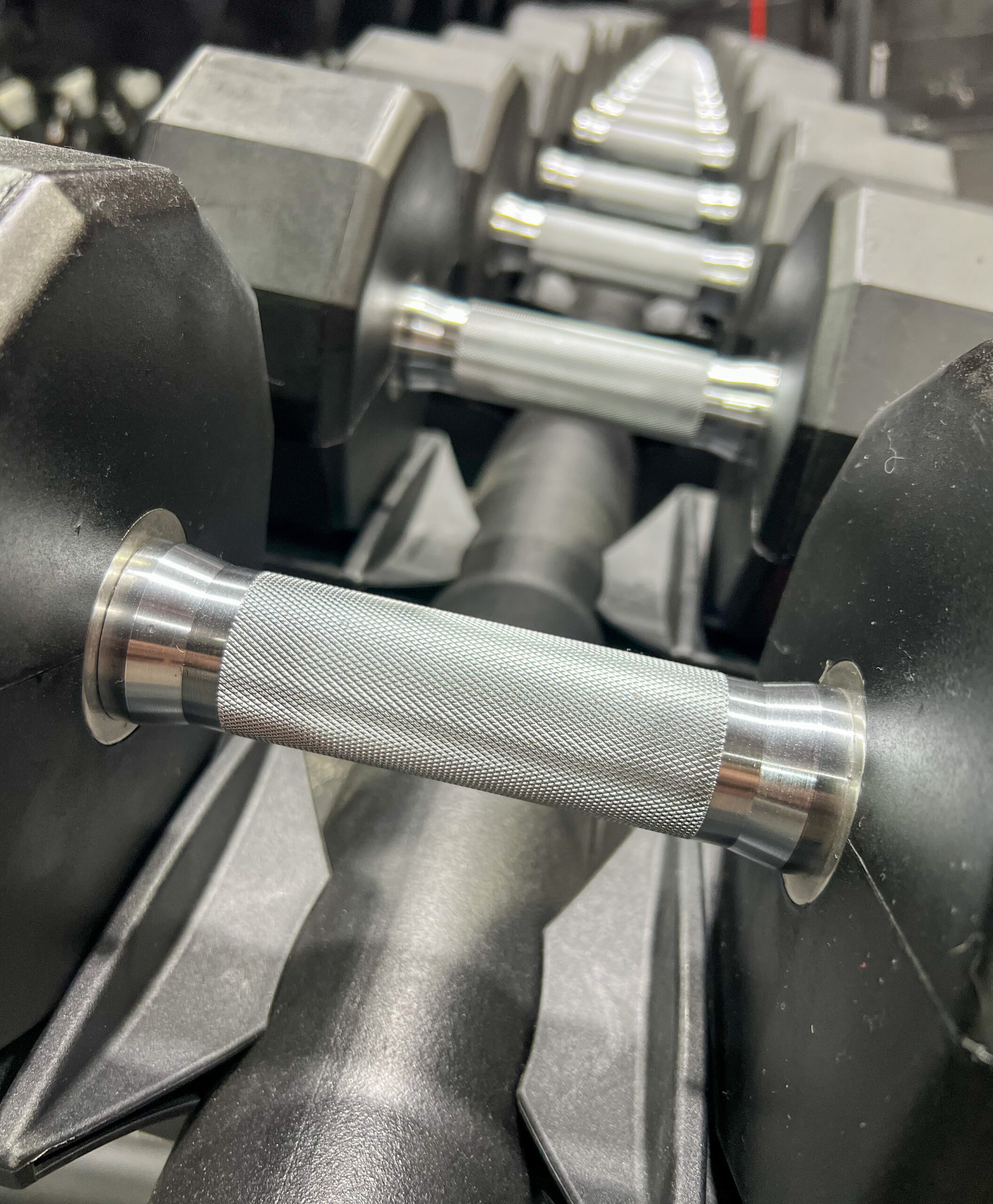 Each precision-machined handle on Urethane Dumbbells is the same 5.75″ in length and includes a medium-grade knurling for a firm but comfortable grip. The handle diameter is 34MM for dumbbells up to 50LB and 37MM for dumbbells 50LB and up.