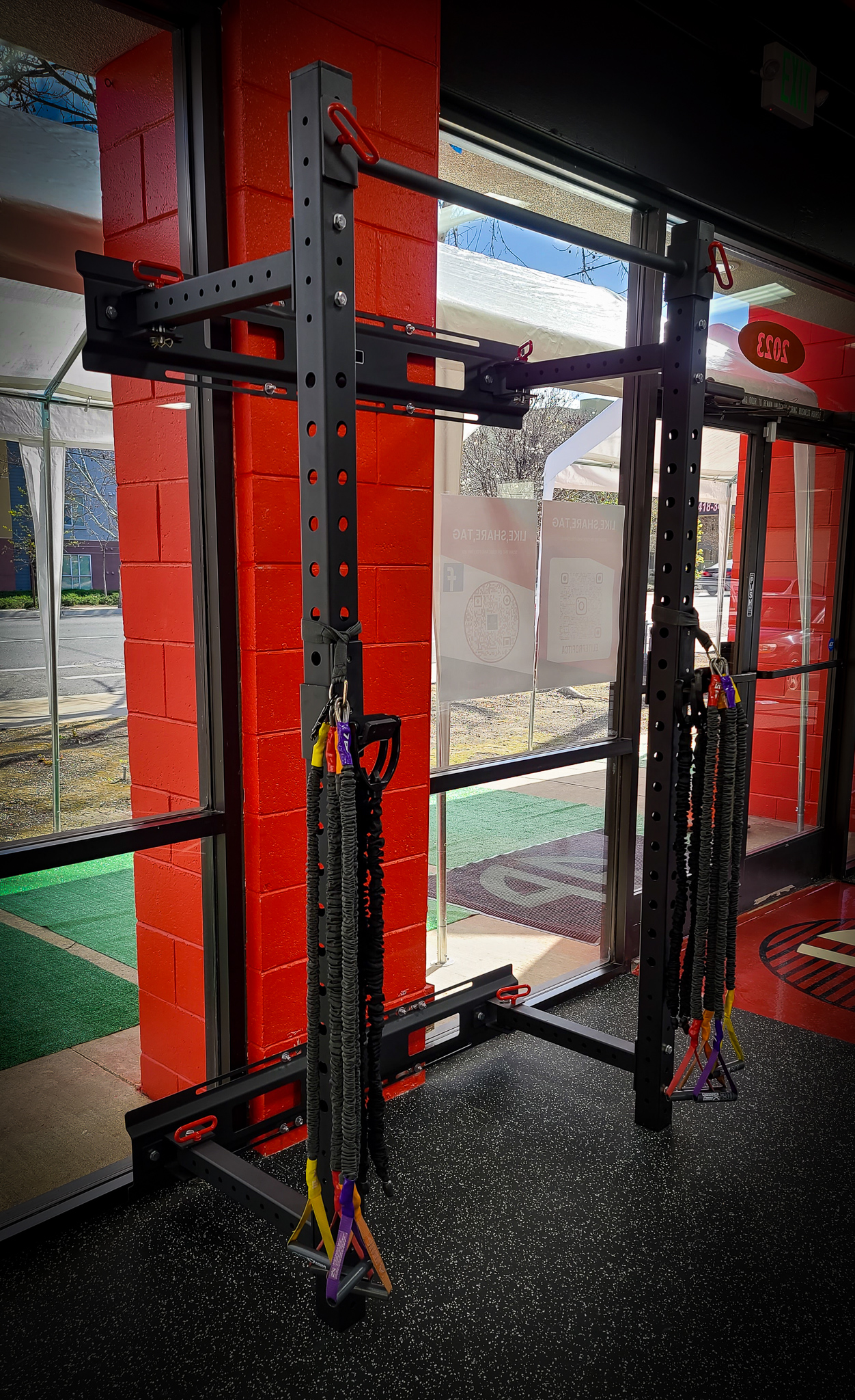 The Fold-Back Rack includes two laser-cut, 3×3″ 11 gauge steel uprights, with Westside hole spacing through the bench/pull area and 2″-on-center spacing above and below. All steel is powder coated.