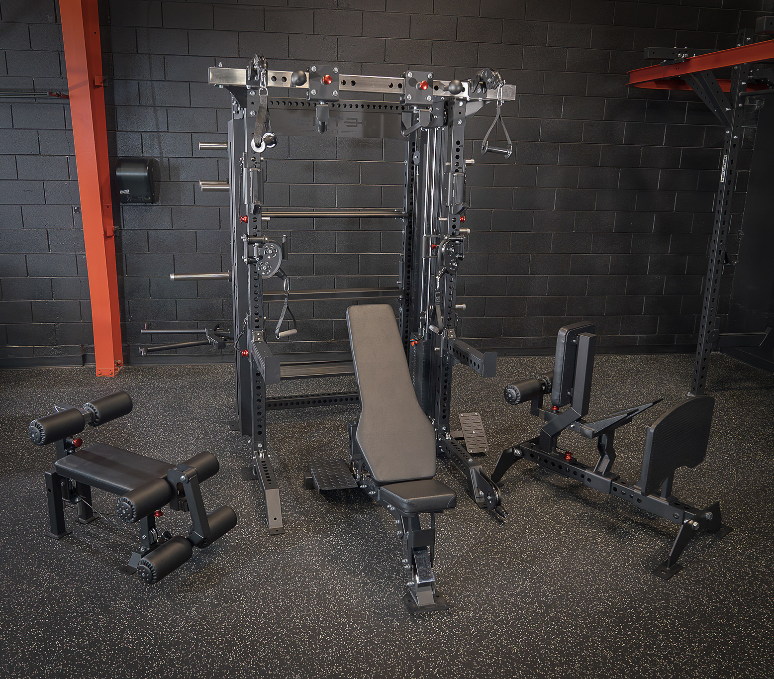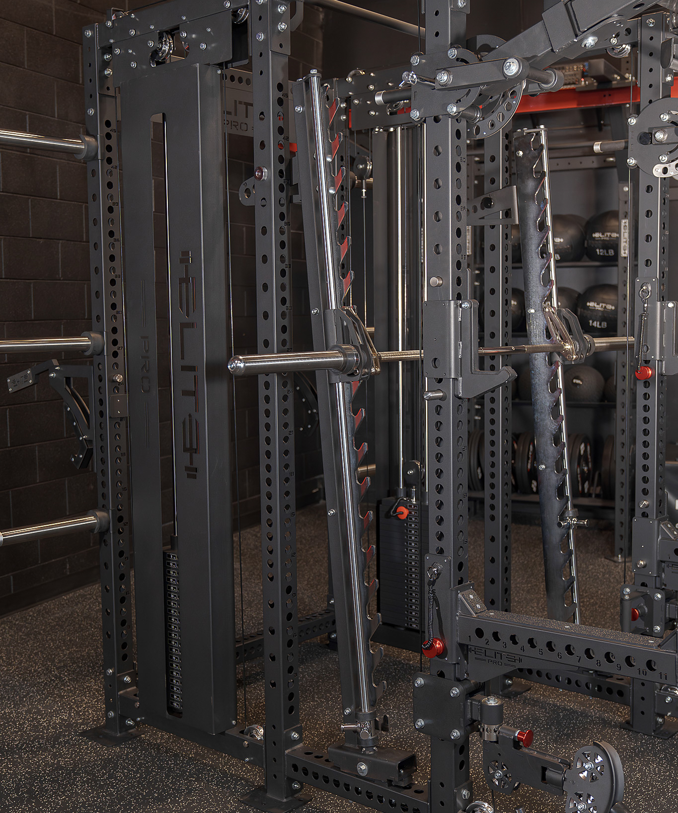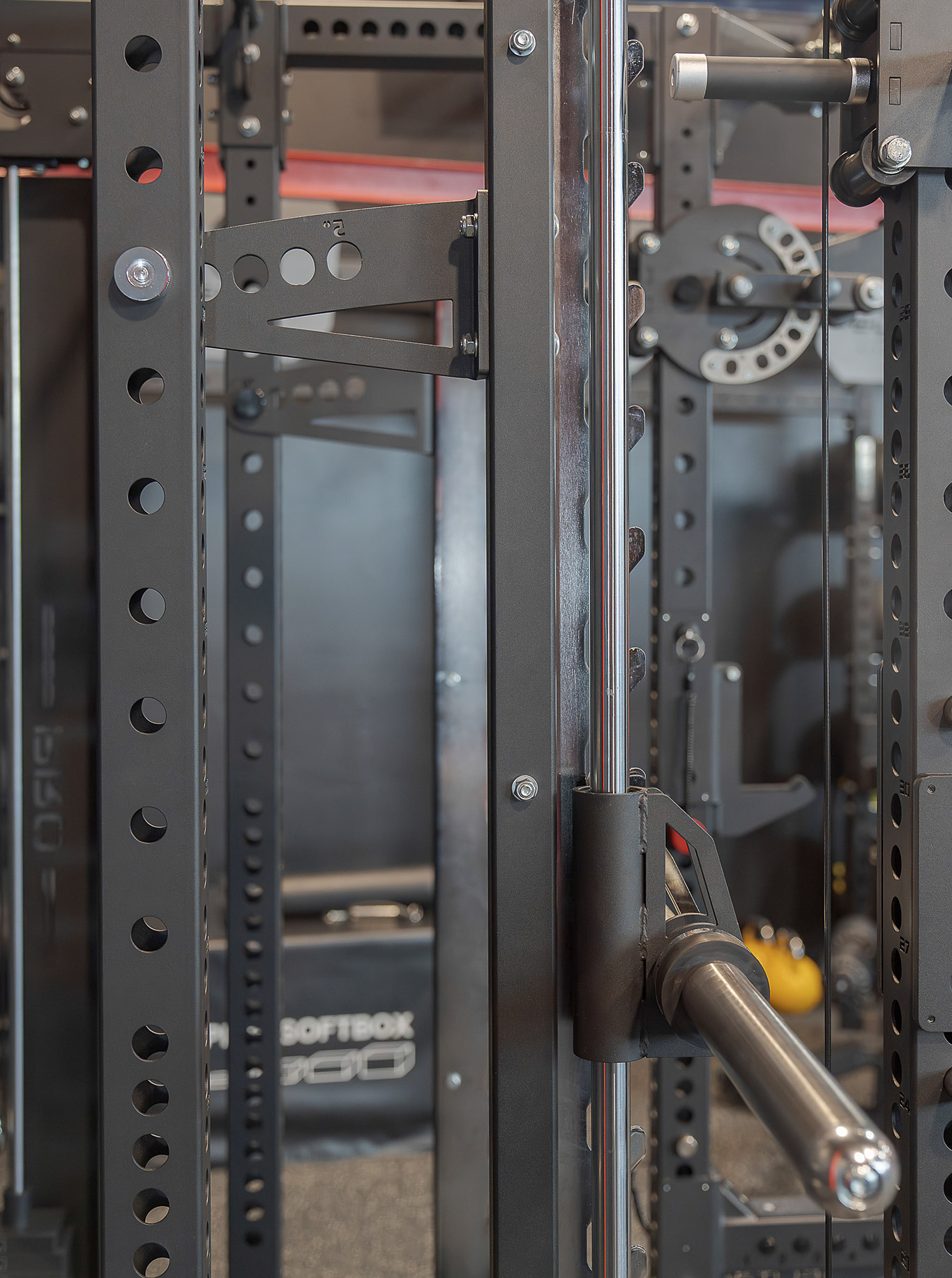 Designed with comfortable knurling and multiple grip options, this pull-up bar offers versatility for targeting various upper-body muscles, complemented by ergonomic globes for advanced grip training.Advanced Smith Machine with Adjustable Angles: