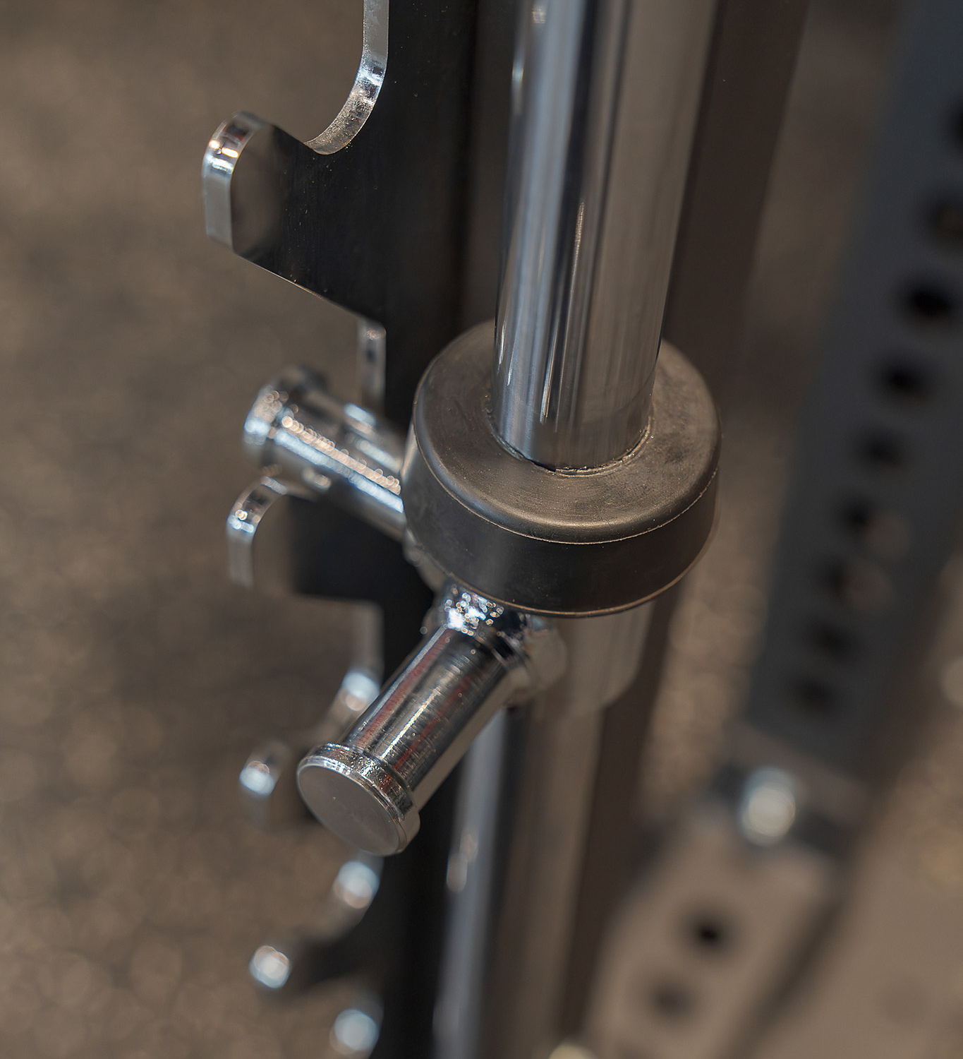It holds up to 1,200 lbs of bumper plates or 2,000 lbs of Olympic plates. - Adjustable Smith Safety Catches: