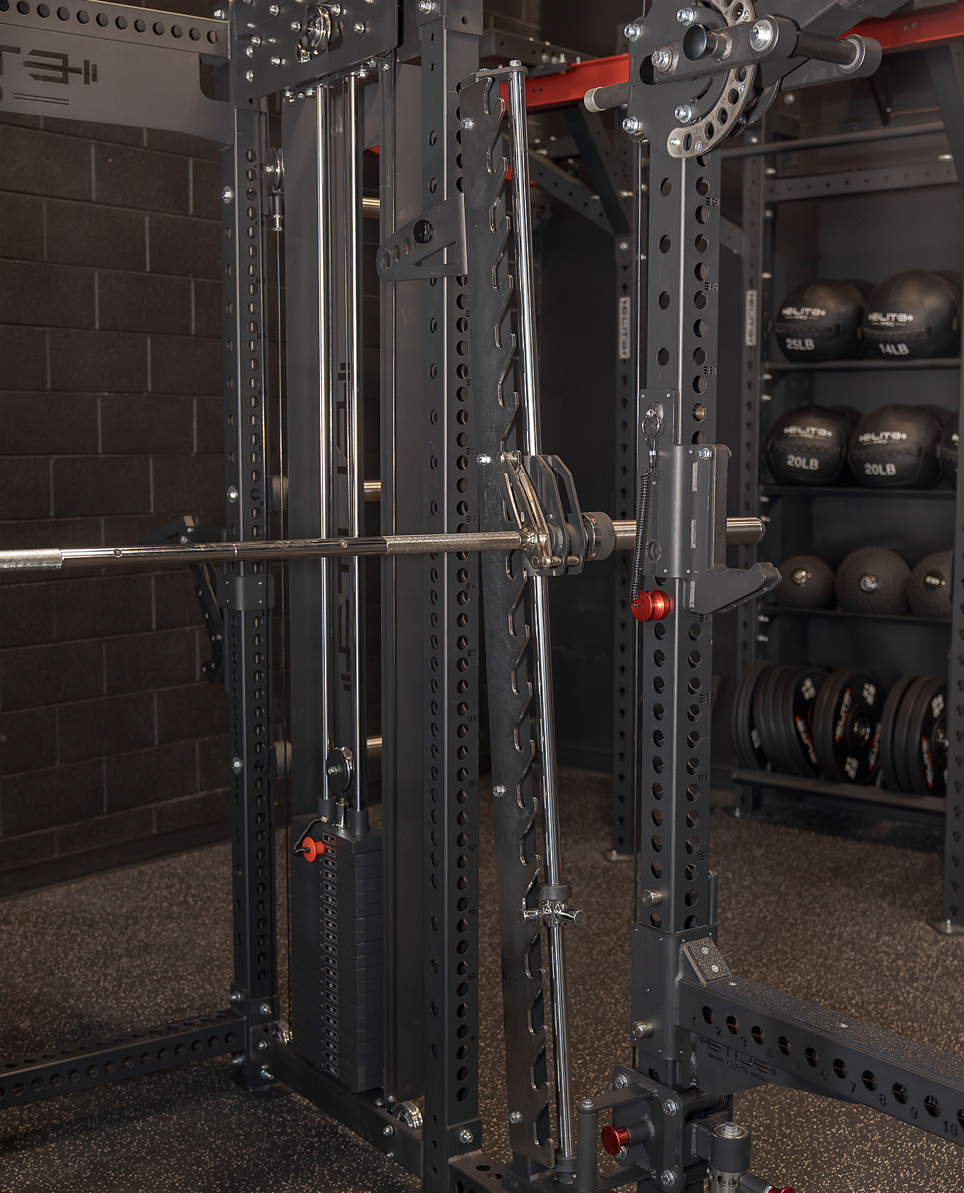 Adjustable for different lifters, it offers an advanced rack-mounted system for heavy lifts, reducing the need for stepping out of the rack. - Ball Storage